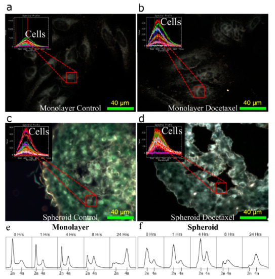 Synchronization of tissue culture models with docetaxel. (a,c) Darkfield images of a (a) monolayer of HeLa cells and a (c) HeLa spheroid section. (b,d) Darkfield images of a (b) monolayer of HeLa cells and a (d) HeLa spheroid section treated with docetaxel. Overlay: Hyper spectral imaging yields a spectrum that shows no gold in the images. Scale bar is 40 (e,f) Cell cycle distribution after 0, 1, 4, 8, and 24 h of treatment with docetaxel in a (e) monolayer of HeLa and a (f) HeLa spheroid.