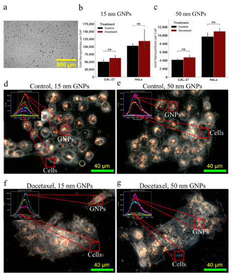 Gold nanoparticle update in two-dimensional cell model. (a) Brightfield image of a monolayer of HeLa in a 96-well microplate. Scale bar is 1000 . (b,c) Uptake of the 15 nm and the 50 nm functionalized gold nanoparticles, with and without docetaxel. Treatment time was 24 h. Error bars signify one standard deviation from average of three independent measurements. (d–g) Darkfield imaging of CAL-27 cells with 15 nm and 50 nm functionalized gold nanoparticles, with and without docetaxel. Overlay: Hyper spectral imaging yields a spectrum that is matched to the gold in the sample. Scale bar is 40 . ns indicates no significance.