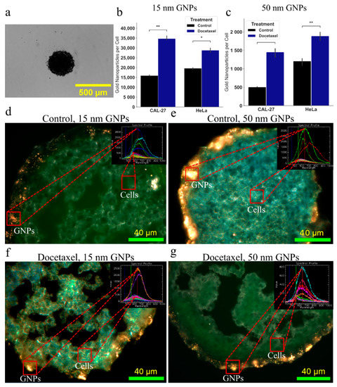 Spheroids were grown to a size of ~300–400 m as previously described, as seen in Figure 5a, and then treated with the determined doses of DTX along with 7.5 of GNPs for 24 h. Results can be seen in Figure 5b,c, along with darkfield images of 10 sections of the CAL-27 spheroids in Figure 5d,g. Similar to the monolayer model, we see larger uptake of smaller 15 nm GNPs with PEG and RGD into the spheroids when compared to the larger 50 nm GNPs, as expected. However, the magnitude of the difference changed, with HeLa only having a 23% increase in 15 nm GNP uptake relative to CAL-27, compared to 100% increase in monolayer. Interestingly, the larger 50 nm GNP uptake still had a 130% increase comparing HeLa to CAL-27. This model dependent behavior is important to note as another advantage when using a 3D spheroid over a 2D monolayer. With DTX, in the case of the 3D spheroid model, for CAL 27, there was a significant (p = 0.0016) increase in 15 nm GNP uptake with DTX of 117% and a significant (p = 0.012) increase in 50 nm uptake with DTX of 186%, as compared to GNP alone. Likewise, for HeLa in a 3D spheroid model, there was a significant increase (p = 0.01428) in 15 nm GNP uptake with DTX of 47% and a significant (p = 0.0037) increase in 50 nm GNP uptake with DTX of 56%. This is in contrast with the results seen in the 2D monolayer model; despite controlling for growth rate, there is a dramatic increase in GNP uptake with DTX, with the magnitude depending on the cell line. This may be a result of the reduced organization of the extracellular matrix due to the DTX, as can be seen in the darkfield images, allowing for deeper penetration of GNPs. However, due to the constraints of darkfield imaging, GNPs cannot be properly seen unless aggregated inside of endosomes and lysosomes within the cells. As the number of GNPs that penetrate falls off quickly with depth, the limitations of darkfield imaging hinder confirmation of this theory due to less GNPs being encapsulated in lysosomes. Improved methods of imaging may include confocal imaging and transmission electron microscopy to better analyze the mechanics of encapsulation of GNPs. Another possibility that is also likely is that due to the higher dose of DTX given, cells on the outer radius of the spheroid see a larger effect, which are the same cells that uptake the bulk the GNPs. As a result, the effect seen in monolayer is amplified, due to the larger dose, and we see more GNPs. Images of HeLa spheroids can be seen in Figure S5.
