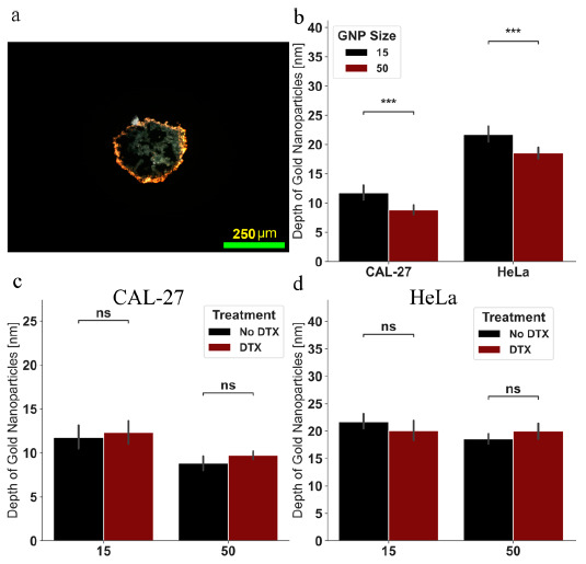 Depth of penetration of gold nanoparticles. (a) Darkfield image of HeLa spheroid with 50 nm functionalized gold nanoparticles without docetaxel. Scale bar is 250 (b) Depth of visible penetration of gold nanoparticles as measured using darkfield images of spheroids from the 10× objective. (c,d) Depth of gold nanoparticle visible penetration with and without docetaxel for (c) CAL-27 and (d) HeLa. Error bars represent 1 standard deviation from a minimum 100 measurements. ns indicates no significance, *** indicates 0.0001 < p < 0.001.