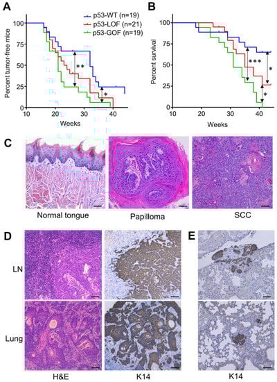- Acin, S.; Li, Z.; Mejia, O.; Roop, D.R.; El-Naggar, A.K.; Caulin, C. Gain-of-function mutant p53 but not p53 deletion promotes head and neck cancer progression in response to oncogenic K-ras. J. Pathol. 2011, 225, 479–489. [Google Scholar] [CrossRef] [PubMed]