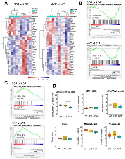 3.5. Upregulation of IL17 Signaling and Depletion of Exhausted CD8 Cells in the Microenvironment of p53-GOF Papillomas
