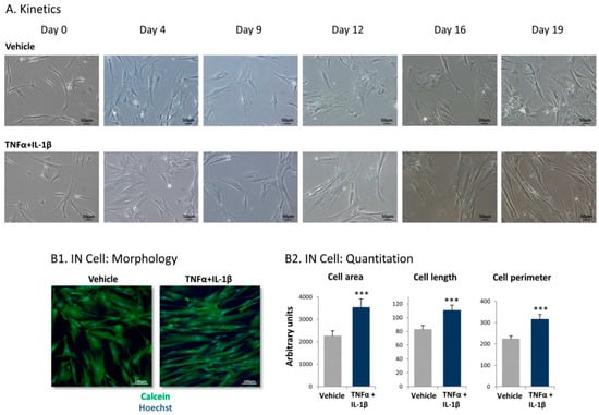 In morphological studies, MSCs were treated by TNFα + IL-1β/vehicles for up to 19 days. At different time points, the cells were photographed using light microscopy. In parallel, in IN Cell studies, MSCs were cultured for 14–18 days in 384-well microplates (#781091, Greiner Bio-One, Kremsmunster, Austria) under automated High-Throughput Screening conditions (Freedom EVO 200 robot, Tecan Group Ltd., Männedorf, Switzerland). The cells were stained and imaged by the IN Cell Analyzer 2200 automated microscope (GE Healthcare, Arlington Heights, IL, USA) at X20 magnification (40 replicates/treatment). Cell and nucleus sizes were determined by cytoplasmic and nuclear staining using calcein (#C3100MP, Thermo Fisher Scientific, Waltham, MA, USA) and Hoechst (#H1399, Thermo Fisher Scientific), respectively. Following image acquisition, high-content image stacks were analyzed using the IN Cell developer Toolbox 1.9.3 (GE Healthcare) producing an output based on comparative fluorescence intensity.