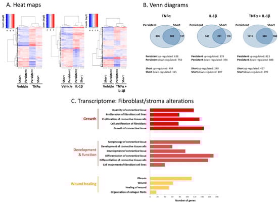 Persistent stimulation of MSCs by TNFα + IL-1β leads to prominent alterations in gene expression and in fibroblast-relevant transcriptional programs in the resulting CAF-like cells. Human MSCs were exposed to “persistent” stimulation by TNFα and/or IL-1β for 14 days or to “short” stimulation of 48 h (concentrations as in Figure 1) in three independent biological repeats, followed by RNAseq analyses. Control cells were treated using the vehicles of the cytokines. (A) Heat maps. Deseq-normalized counts, values were centered. (B) Venn diagrams. Upregulated genes: FC > 2, padj < 0.05; downregulated genes: FC < 0.5, padj < 0.05. (C) Fibroblast-relevant transcriptional programs that were significantly modified by persistent TNFα + IL-1β stimulation, at FC > 2 or FC < 0.5 and padj < 5 × 10−10, are demonstrated.