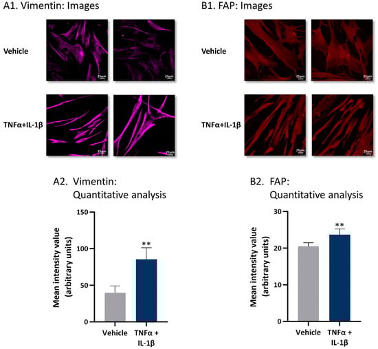 Following persistent stimulation of MSCs with TNFα + IL-1β, the resulting CAF-like cells express typical CAF markers. Human MSCs were exposed to persistent TNFα + IL-1β stimulation (concentrations as in Figure 1) or to vehicles, generally for 14–18 days. The expressions of vimentin (A) and fibroblast activation protein (FAP) (B) were determined by confocal analyses. (A1,B1) Two representative images are demonstrated for each treatment, derived from a representative experiment out of n = 3. Bar, 25 μm. (A2,B2) Quantitative analyses of the fluorescence intensity performed by the ImageJ program on images of the representative experiment (n ≥ 5 images for each treatment). ** p < 0.01.