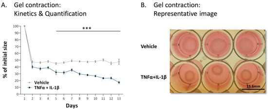 MSCs were persistently treated with TNFα + IL-1β/vehicles, generally for up to 14–18 days. Afterwards, the cells were cultured in 24-well plates in collagen-containing medium (0.5 mg/mL; #345236, Corning, Corning, NY, USA) with or without TNFα + IL-1β and were incubated at 37 °C for 1 h for collagen gel polymerization. Then, the collagen gels were gently released from the edges of the wells using a sterile tip and the plates were returned to incubation for up to 13 day; exogenous cytokines were not replenished during this incubation period. Images of the gels were taken from the top of the plates at different time points. Contraction quantification was performed using ImageJ program.
