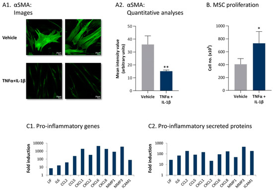 To follow up on our above findings demonstrating that the continuous TNFα + IL-1β stimulation leads to the generation of CAFs and in view of recent studies on CAF plasticity [36,37,38,39], we then asked what is the phenotype of the inflammation-driven CAFs. In line with the characteristics of inflammatory CAFs identified in pancreatic ductal adenocarcinoma (PDAC) and the major roles of IL-1 in their generation [50,51], we found out that the inflammation-driven CAFs expressed typical phenotypic characteristics of inflammatory CAFs. The images and quantitative analyses of Figure 5 demonstrate that, in comparison to MSCs exposed to vehicle, MSCs that were persistently stimulated by TNFα + IL-1β (1) expressed much lower levels of αSMA (Figure 5A); (2) had increased proliferation rates (Figure 5B), as demonstrated also in a time-dependent analysis (Figure S2); and (3) expressed elevated mRNA levels of inflammatory genes, including interleukin-6 (IL-6) and leukemia inhibitory factor (LIF) (Figure 5(C1); p values are given in Figure legend).
