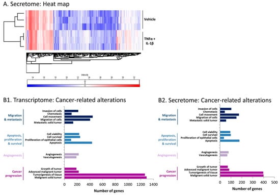 In view of the powerful roles of CAFs in regulating cancer progression [11,33,34,35], we explored the possibility that CAFs obtained following persistent stimulation of MSCs by TNFα + IL-1β undergo alterations in the expression of cancer-related genes. Indeed, as demonstrated in Figure 6(B1), the inflammation-driven CAFs demonstrated prominent changes in the expression levels of genes that control migration and invasion, apoptosis, proliferation and survival, angiogenesis, and tumor progression, where all indicated disorders obeyed the cutoff of p < 5 × 10−17. In parallel, secretome analysis of the inflammatory CAFs demonstrated pronounced modifications in the same pathways at the cutoff of p < 5 × 10−8 (Figure 6(B2)), with outstanding similarity to the gene expression pattern (Figure 6(B1)). These findings indicate that continuous stimulation of MSCs by TNFα + IL-1β greatly modified the expression of genes related to malignancy and of their corresponding secreted proteins.