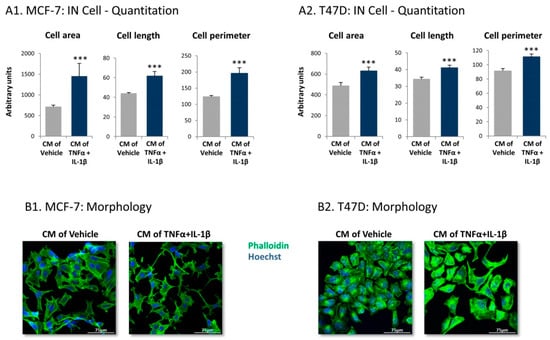Following persistent stimulation of MSCs with TNFα + IL-1β, the resulting inflammatory CAFs release factors that induce morphological changes in luminal-A breast cancers (BC) cells. Human MSCs were exposed to persistent TNFα + IL-1β stimulation (concentrations as in Figure 1) or to vehicles, generally for 14–18 days. At the end of the stimulation period, cytokines were replaced by fresh cytokine-devoid media, and 48 h later, conditioned media (CM) were collected and administered to human luminal-A BC cells. (A) Tumor cell characteristics were quantified 4 days or 3 days after the addition of CM to MCF-7 cells (A1) and to T47D cells, repectively (A2) by IN Cell technology. The results of a representative experiment out of n = 3 are presented. *** p < 0.001. (B) Tumor cell morphology was photographed by confocal microscopy 2–3 days after the addition of CM, using phalloidin staining of actin filaments (green) and Hoechst staining of nuclei (blue). (B1) MCF-7 cells. (B2) T47D cells. Images from a representative experiment out of n = 3 are presented. Bar, 75 μm.