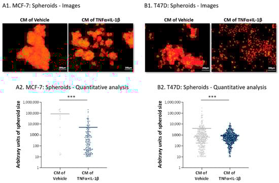 The dispersed distribution of the cancer cells following their growth with CM of inflammatory CAFs was also evidenced in the study of tumor spheroids. In this test, the tumor cells were grown in conditions that did not allow them to adhere to substrates; thus, they tended to create large spheroids by forming cell-to-cell contacts (similar to the approach taken in [52]). Using this test, we determined the ability of the cancer cells to spread out from spheroids (MCF-7 cells) or to form the spheroids (T47D cells) when incubated with cytokine-devoid CM of the inflammatory CAFs. The spheroid images of the cancer cells in Figure 8(A1,B1) and the quantification of their sizes (Figure 8(A2,B2)) clearly demonstrate that, whereas cancer cells grown with the CM of control MSCs formed large solid spheroids in which tight cell-to-cell contacts were formed, tumor cells that were treated by inflammatory CAF-derived cytokine-devoid CM exhibited dispersion abilities (MCF-7 cells; Figure 8A) or remained in dispersed organization characterized by small cell aggregates (T47D cells; Figure 8B). This type of arrangement of the inflammatory CAF-CM-treated cancer cells may attest to a preference towards elevated scattering, which may serve their needs well when they metastasize.