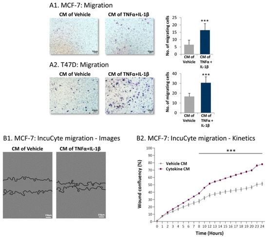 Following persistent stimulation of MSCs with TNFα + IL-1β, the resulting inflammatory CAFs release factors that promote migration of luminal-A BC cells. Human MSCs were exposed to persistent TNFα + IL-1β stimulation (concentrations as in Figure 1) or to vehicles, generally for 14–18 days. Cytokine-devoid CM were collected as described in Figure 7 and were administered to mCherry-expressing MCF-7 and T47D human luminal-A BC cells. (A) Tumor cell migration was determined in fibronectin-coated transwells in response to serum-containing medium. (A1) MCF-7 cells. (A2) T47D cells. Images and quantitative analyses of a representative experiment out of n = 3, for each cell type, are presented. *** p < 0.001. (B) MCF-7 wound closure assay, performed in IncuCyte®. (B1) Representative images taken at 24 h. Bar, 150 µm. (B2) The kinetics graphs of tumor cell migration demonstrate the proportion (%) of the original wound area that became covered by migrating cells at each time point. The results presented are mean ± SEM of 5 replicates for each treatment and are of a representative experiment out of n > 3. *** p < 0.001.