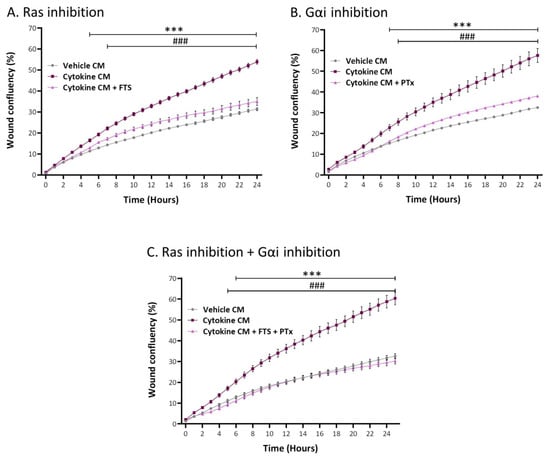 Tumor cell migration, elevated by inflammatory CAF-derived factors, is mediated through cooperativity between Ras-activating receptors and G protein-coupled receptors (GPCR) that signal via Gαi. Human MSCs were exposed to persistent TNFα + IL-1β stimulation (concentrations as in Figure 1) or to vehicles, generally for 14–18 days. Cytokine-devoid CM were collected as described in Figure 7 and were administered to MCF-7 cells in the presence of (A) FTS, an inhibitor of Ras; (B) PTx, an inhibitor of Gαi; or (C) both inhibitors together. Control cells were treated by the vehicles of inhibitors. Inhibitor concentrations were selected based on the considerations described in the Materials and Methods section. Cell numbers and viability were not affected by the inhibitors. Then, kinetics analyses of wound closure assays were performed in IncuCyte®, as described in Figure 9B. The results are presented as mean ± SEM of 8–9 replicates for each treatment. *** p < 0.001, for differences between tumor cells treated by CM of inflammation-derived CAFs and control CAFs. ### p < 0.001, for differences between tumor cells treated by the inhibitors and tumor cells that were not treated by the inhibitors. The results of a representative experiment out of n = 3 are presented.