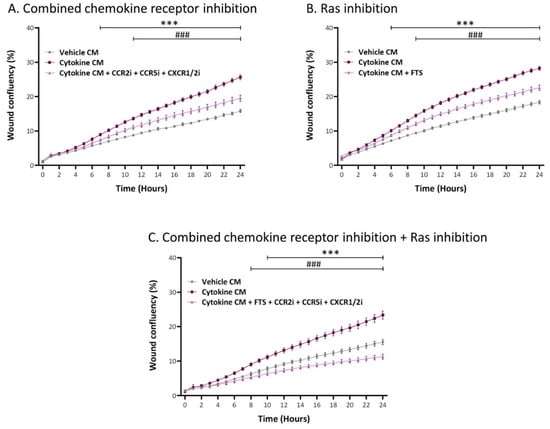 Tumor cell migration, elevated by inflammatory CAF-derived factors, is mediated through cooperativity between Ras-activating receptors and chemokine receptors. Human MSCs were exposed to persistent TNFα + IL-1β stimulation (concentrations as in Figure 1) or to vehicles, generally for 14–18 days. Cytokine-devoid CM were collected as described in Figure 7 and were administered to MCF-7 cells in the presence of inhibitors. In the same experiment, different inhibitory conditions were used: (A) combined inhibition of CCR2, CCR5, and CXCR1/2 together, as in Figure 11. (B) Inhibition of Ras-mediated signaling by FTS. (C) Combined inhibitory measures directed to chemokine receptors and Ras-mediated signaling. In all treatments, cell numbers and viability were not affected by the inhibitors (except for the inhibitory treatment included in part C, where 15–25% decrease in cell numbers was noted). Kinetics analyses of wound closure assays were performed in IncuCyte®, as described in Figure 9. The results are presented as mean ± SEM of 8–9 replicates for each treatment. *** p < 0.001, for differences between tumor cells treated by the CM of inflammation-derived CAFs and control CAFs. ### p < 0.001, for differences between tumor cells treated by the inhibitors and tumor cells that were not treated by the inhibitors. The results of a representative experiment out of n = 3 are presented.
