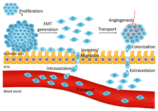 Cancer metastasis occurs in several stages, including proliferation, epithelial-to-mesenchymal transition (EMT), invasion, transport, colonization, and angiogenesis (Figure 1) [1]. In fully developed tumorigenesis stages, circulating tumor cells move into another tissue and transform into mesenchymal stem cell-like cells as a result of EMT [2,3]. EMT is the initiation step in cancer metastasis [4]. Tumor cells are transported through the bloodstream after invading blood vessels [5,6,7] in a process called intravasation [8]. The metastasized tumor cells attach and grow via colonization; then, the blood vessels that supply nutrients are generated during angiogenesis, leading to cancer development [2,9,10]. In many stages of metastasis, the proteins and factors related to metastasis are intricate [11]. Therefore, messenger signaling to block metastasis and tumorigenesis is necessary for the fundamental processes that regulate initial signaling factors, but protein signaling is not. Breast cancer is the most common cancer type, and it has been considered one of the most malignant cancers in women worldwide [12,13]. Breast cancer subtypes include triple-negative and triple-positive breast cancer resulting from the existence and nonexistence of estrogen receptors, progesterone receptors, or human epidermal growth factor receptor-2 (HER2) [14,15]. Each subtype has the following cell lines: triple-negative (MDA-MB-231, MDA-MB-486, and MCF-10A [16,17]), triple-positive (BSMZ, BT474, and EFM192A [16]), and hormone receptor-positive cell lines that express estrogen receptors and progesterone receptors in the absence of HER2 (MCF-7 and T47D [16]). Genotypic or phenotypic heterogeneity of breast cancer is diverse. While triple-negative breast cancer generally has the most aggressive behavior and poor clinical outcomes [18,19,20], triple-positive breast cancer has also been found to exhibit aggressive behavior, despite the availability of antibody-targeted therapy or chemotherapy [21].