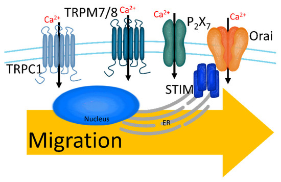 The upregulated Ca2+ channels in migratory breast cancer cells. Increased [Ca2+]i through TRPC1, TRPM7/8, P2X7, and SOCC induces migration and intravasation.