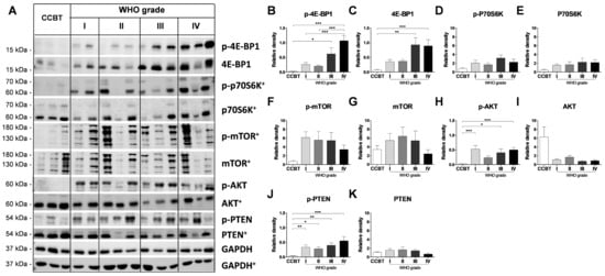 First, we aimed to confirm the activation of the PI3K/AKT/mTOR pathway using immunoblot analyses (Figure 1). The expression of 4E-BP1 (Figure 1B) and its phosphorylated form (Figure 1C) increased stepwise from low grade gliomas (LGGs) to GBM compared to non-neoplastic cortical control brain tissue (CCBT). Expression of p-4E-BP1 was significantly higher compared to CCBT (III: p < 0.05, IV: p < 0.001). In addition, the p-4E-BP1 protein expression differed significantly between LGGs and GBM (II: p < 0.001, III: p < 0.001; Figure 1B). Significantly increased protein expression was also detected for p-AKT (I: p < 0.001, III: p < 0.05, IV: p < 0.001; Figure 1H) and p-PTEN (I: p < 0.01, II: p < 0.05, III: p < 0.01, IV: p < 0.001; Figure 1J). p-p70S6K (Figure 1D) and p-mTOR (Figure 1F), were not increased significantly compared to controls.