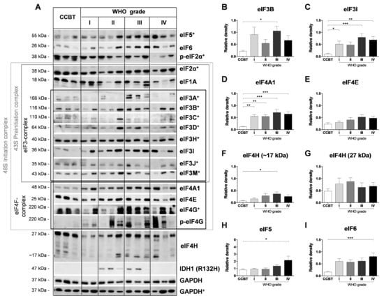 The following are available online at https://www.mdpi.com/2072-6694/13/6/1482/s1: Figure S1: Densitometric analysis of eIF immunoblots in astrocytomas (WHO grades I–IV) compared to CCBT. Figure S2: Influence of eIF gene expression on patients’ OS in LGG (WHO grades I–II) and GBM (WHO grade IV). Figure S3: Immunohistochemical evaluation of eIF3I and eIF4H protein expression in astrocytomas (WHO grades I–IV) compared to CCBT in consideration of the IDH1 (R132H) mutation status. Figure S4: Influence of eIF protein expression on patients’ OS in LGG (WHO grades I–II) and HGG (WHO grades III–IV). Table S1: Descriptive statistics of clinicopathological characteristics and immunohistochemical evaluation. Table S2: Oligonucleotides used for qRT-PCR analyses. Table S3: Primary antibodies used for immunoblot and immunohistochemical analyses. Antibody dilutions for immunohistochemical analyses are listed in parentheses. Table S4: Correlation coefficients comparing EIF3I and EIF4H with glioma-relevant genes. Table S5: Correlation coefficients of high and low expression of glioma-relevant genes. Table S6: Survival comparison with p-values of high vs. low expression of glioma-relevant genes.