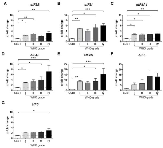 Next, mRNA expression was determined for eIF3B (I: p < 0.05, II: p < 0.01, IV: p < 0.01; Figure 3A), eIF3I (I: p < 0.01, III: p < 0.05, IV: p < 0.001; Figure 3B), eIF4A1 (I: p < 0.05, III: p < 0.05, III: p < 0.05, IV: p < 0.01; Figure 3C), eIF4E (I: p < 0.05, III: p < 0.05, IV: p < 0.001; Figure 3D) and eIF4H (I: p < 0.01, III: p < 0.05, IV: p < 0.001; Figure 3E). mRNA levels were significantly higher in all tumor grades compared to CCBT. eIF5 (Figure 3F) expression showed a high variability throughout all samples and eIF6 (IV: p < 0.01; Figure 3G) expression was only elevated in high grade gliomas (HGGs) compared to CCBT.
