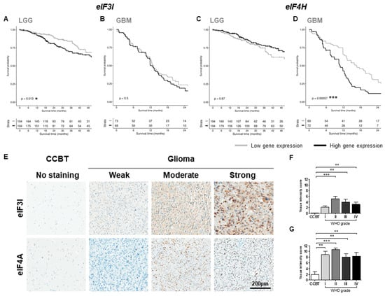 Only eIF3I and eIF4H were significantly associated with patient outcome. Higher eIF3I expression was significantly associated with reduced OS in LGG patients (p < 0.05; Figure 4A) but did not affect the survival of GBM patients (Figure 4B). eIF4H (p < 0.001; Figure 4D) was negatively correlated with the OS of GBM patients, but not of patients with LGGs (Figure 4C). eIF3B (Figure S2A) and eIF4E (Figure S2E) showed a tendency to be associated with a reduced OS for LGG patients and eIF3B (Figure S2F) and eIF4A1 (Figure S2G) for GBM patients. Gene expression of eIF5 (Figure S2D,I) and eIF6 (Figure S2E,J) was not associated with decreased OS.