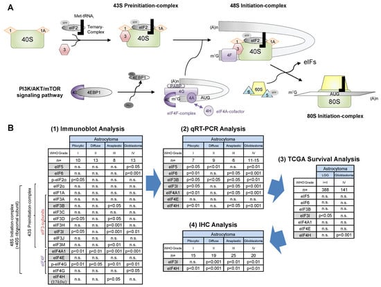 Summary of the eIF basic characterization in astrocytomas (WHO grades I–IV). Illustration of eukaryotic translation initiation (A). Translation initiation begins with the formation of the 43S preinitiation complex in which the 40S ribosomal subunit associates with a ternary complex (eIF2-GTP-Met-tRNAi) with the support of eIF1, eIF1A and the eIF3 complex (including eIF3I). For cap-dependent translation initiation, activation of the PI3K/AKT/mTOR signaling pathway initiates the dissociation of 4E-BP1 and eIF4E via the phosphorylation of 4E-BP1, allowing eIF4F complex formation. eIF4H is a co-factor of eIF4A and stimulates its helicase activity. The eIF4F complex (eIF4A, eIF4E and eIF4G) recognizes the m7G cap of the mRNA and associates via eIF4G with the eIF3 of the PIC. This leads to the formation of the 48S initiation complex. After the scanning process for the AUG start codon, the 60S ribosomal subunit joins the 48S initiation complex under the assistance of eIF5 and eIF6. eIF5-mediated hydrolysis of the ternary complex leads to the dissociation of the eIFs and the formation of an elongation-competent 80S ribosome. Schematic diagram of the search for novel eIF biomarkers in astrocytomas of WHO grades I–IV (B). For each analysis, numbers of individuals included and analyzed eIFs are listed. p-values listed in the table reveal significant differences between the respective tumor grade and CCBT. (1) First, 18 eIF subunits were investigated using immunoblot analyses. (2) Next, 7 out of 18 eIFs (marked in grey) were selected for further qRT-PCR analyses based on significant differences between CCBT and astrocytomas (WHO grades I–IV). (3) All 7 eIFs (marked in grey) were additionally analyzed regarding their impact on patients’ OS. (3) eIF3I and eIF4H significantly influenced the OS glioma patients and therefore were finally analyzed immunohistochemically. Abbreviations: CCBT, non-neoplastic cortical control brain tissue; LGG, low grade glioma; PIC, preinitiation complex.