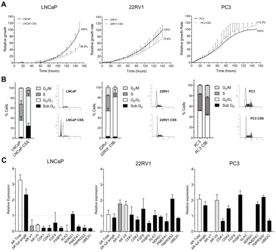 First, the effect of androgen deprivation therapy (ADT) during 5 days on the three PCa cellular models was analysed. Hormonal-deprivation-produced growth rates decreased in both androgen sensitive cell lines (51% and 24% for LNCaP and 22RV1, respectively), while the PC-3 cell line showed no differences over control cells at the proliferative level (Figure 1A). Regarding the cell cycle analysis, a cell cycle arrest at G0/G1 for both LNCaP and 22RV1 was observed (Figure 1B and Figure S4). Moreover, the G0/G1 phase arrest was accompanied by cell death induction detected by the presence of a Sub-G0 peak exclusively in LNCaP cells (Figure 1B), indicating that this cell line is more sensitive to ADT than 22RV1. As previously described, no cell cycle arrest or cell death was detected in PC-3 cells, confirming their ADT treatment resistance (Figure 1B and Figure S4).