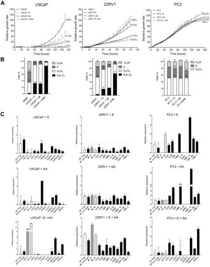 Once PCa patients develop CRPC, NHA therapies with AA or Enz are administered. To understand the molecular mechanisms behind those therapies, we treated the three PCa cell lines with AA (20 μM), Enz (40 μM) or the combination of both for 5 days. When cell proliferation was analysed, we observed that AA was significantly more efficient reducing proliferation rates than Enz in both LNCaP (20% vs. 41.4%; p < 0.05) and 22RV1 cells (41.5 vs. 79.5%; p < 0.05). In addition, the combination of Enz with AA (E + AA) had a synergistic effect inhibiting cell growth at a higher rate compared to AA or Enz alone in LNCaP (3.1% vs. 20% for AA, 3,1% vs. 41.4% for Enz; p < 0.05) and in 22RV1 (28.9% vs. 41.5% for AA, 28.9% vs. 79.5% for Enz; p < 0.05). Again, LNCaP cells are more sensitive to NHA therapy than 22RV1 cells. In PC-3 cells, no differences were observed at the proliferative level, demonstrating that this cell line is also resistant to NHA therapies (Figure 2A).