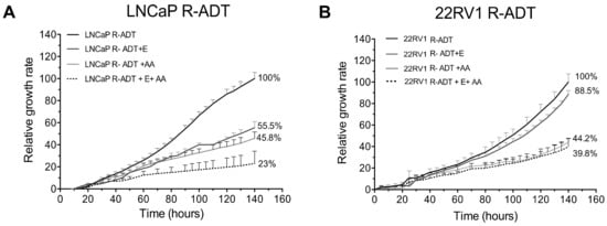 Regarding the potential concomitant use of ADT plus AA or Enz as first-line treatment, the findings from CHAARTED, LATITUDE, and ARCHES trials have demonstrated the improvement of OS and PFS in mCRPC [47]. Our experimental results on the androgen-dependent tumour cell line (LNCaP) showed that the concomitant use of ADT and Enz did not increase treatment efficiency; on the contrary, we detected less ability to reduce cell tumour growth. Similar results were obtained with 22RV1, which exhibited a better tolerance to ADT. However, the combination of AA with ADT showed a significant ability to reduce growth rates, especially in LNCaP, until the emergence of resistance. In addition, once this resistance appeared after the concomitant schedule (R-ADT/A), the sequential use of Enz did not reduce cell proliferation, demonstrating the acquisition of cross-resistance between both NHAs, as previously described in mCRPC patients [7,8,9,10,11]. Moreover, our results are consistent with the low efficacy of AA + Enz combination demonstrated in the Alliance trial in mCRPC patients [48] and represent a biological rationale to test the combination therapy with both NHAs within the hormone-sensitive setting before CPRC acquisition.