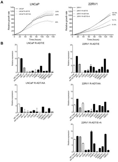 Once resistance to concomitant treatment schedules has been achieved, we evaluated the sensitivity of each cell line to the alternative NHA. The proliferation rate in LNCaP R-ADT/E cells treated with AA under ADT conditions was even slightly higher than in the presence of ADT and Enz (117.4% vs. 100%) (Figure 7A left panel), while LNCaP R-ADT/A cells maintained similar proliferation rates in the presence of ADT and Enz or AA treatments (92.6% vs. 100%) (Figure 7A right panel).