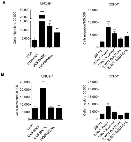Analysis of migration and invasion assays in the resistant lines derived from LNCaP and 22RV1. (A) Migration assays in LNCaP (left panel) and 22RV1 (right panel). (B) Invasion assays in LNCaP (left panel) and 22RV1 (right panel). In both sections the histograms represent the number of cells that migrate or invade per 100,000 cells seeded. Data shown correspond to the mean ± SD calculated from the triplicates made for each condition. (* p < 0.05; ** p < 0.01, *** p < 0.001, t-Student test). The significant differences shown are with respect to the wild-type cell lines.