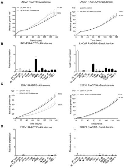 Analysis of cross-resistance between Abiraterone and Enzalutamide from the concomitant cellular models (R-ADT/NHAs + Abiraterone or Enzalutamide). In order to study the cross-resistance to the complementary antiandrogen, R-ADT/E cells were treated with AA (20 μM) (R-ADT/E + Abiraterone), the R-ADT/A cell line was exposed to Enz (40 μM) for 5 days (R-ADT/AA + Enzalutamide), and cell growth was evaluated by xCELLigence. (A) Cell proliferation analysis results for LNCaP cell lines using xCELLigence. Results have been standardized considering the final value after 5 days R-ADT/NHAs cell lines to 100%. LNCaP R-ADT/E + Abiraterone (left panel) and LNCaP R-ADT/A + Enzalutamide (right panel). Data shown correspond to the mean ± SD calculated from the quadruplicates made for each condition. (B) qPCR analysis for AR isoforms and AR target genes. The results are shown normalized with respect to endogenous control (GADPH). The error bars shown correspond to the SD calculated from triplicates. (C) Cell proliferation assays and (D) qPCR analysis for 22RV1 R-ADT/E + Abiraterone (left panels) and 22RV1 R-ADT/A + Enzalutamide (right panels).