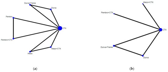 Figure 2 presented the network constructions of eligible comparisons. For OS, ORR, and grade 3–5 adverse events (Figure 2a), seven interventions were included in the network analysis, such as chemotherapy (abbreviation to CTX), ICI alone (atezolizumab, embrolizumab, and durvalumab, abbreviation to Atezo, Pembro, and Durva), ICIs plus CTX (Atezo plus CTX and Pembro plus CTX), and a combination of different ICIs (durvalumab plus tremelimumab, abbreviation to Durva plus Treme). For PFS (Figure 2b), five interventions were included (CTX alone, combination therapy, and durvalumab monotherapy). The effect size of the pairwise comparisons, SUCRA rankings, and probability to be the best treatment were presented in Figure 3 and Figure 4 and Appendix C. Additionally, the subgroup analysis in OS by gender, age, and cisplatin eligibility were summarized in league tables and presented in Appendix D.