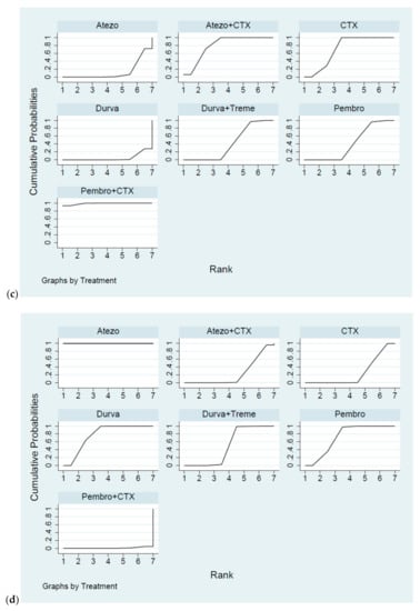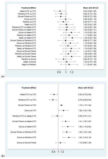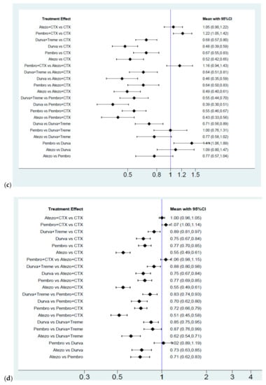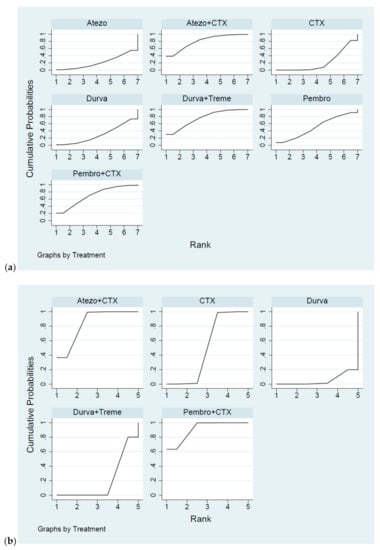 Results were presented in Figure 3b. ICIs plus CTX produced a noticeable benefit over CTX alone (HR = 0.82, 95% CI = 0.70–0.96 for Atezo plus CTX, HR = 0.78, 95% CI = 0.65–0.94 for Pembro plus CTX) but a similar effect was presented between different regimens of ICIs plus CTX (HR = 0.95, 95% CI = 0.75–1.21 for Pembro plus CTX vs. Atezo plus CTX). Durva was associated with a worse performance in PFS compared with CTX alone (HR = 1.16, 95% CI = 1.10–1.22 for Durva plus Treme, HR = 1.28, 95% CI = 1.03–1.59 for Durva). Additionally, the probability of Pembro plus CTX had the highest SUCRA and Prbest scores (SUCRA = 90.8%, Prbest = 63.4%, Figure 4b and Figure A2b), followed by Atezo plus CTX (SUCRA = 84.0%), CTX (SUCRA = 49.0%), Durva plus Treme and (SUCRA = 20.0%), and Durva (SUCRA = 5.2%).