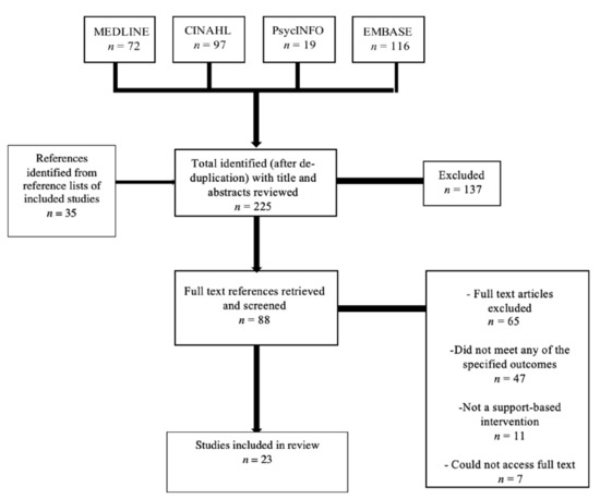 The initial search resulted in 225 publications. Following title and abstract screening, 88 publications went through to full-text review. Twenty-three papers met eligibility criteria and were included in this review (Figure 1).
