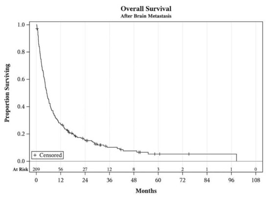 Overall the survival of the entire cohort after diagnosis of brain metastasis.