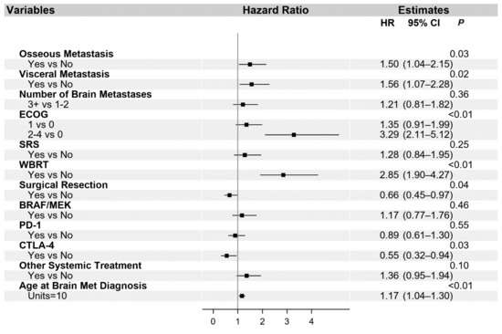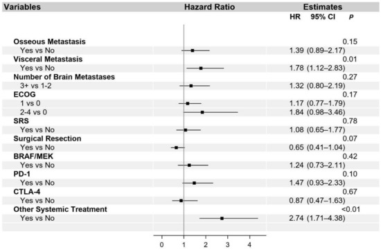 The univariate and multivariable analysis for OS is presented in Table S1 and in Figure 2, respectively. Additionally, univariate (Table S2) and multivariable (Figure 3) analyses were performed for the PFS of systemic interventions. On multivariable analysis, the presence of non-cranial metastatic disease, poor performance status (ECOG 2–4), WBRT, and older age at diagnosis of brain metastasis was associated with poorer OS. WBRT, in particular, was associated with a hazard ratio of 2.85 (95% CI 1.90–4.27). Craniotomy (HR 0.66, 95% CI 0.45–0.97) and treatment with a CTLA-4 checkpoint inhibitor (HR 0.55, 95% CI 0.32–0.94) were the only interventions associated with improved OS. The overall reduced risk of death in patients treated with craniotomy was 34%, and in patients treated with CTLA-4, checkpoint inhibition was 45%. With regard to PFS, visceral metastasis and non-checkpoint and BRAF directed therapies were associated with poorer outcomes.