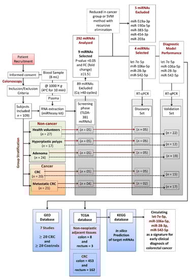 - Wang, S.; Xiang, J.; Li, Z.; Lu, S.; Hu, J.; Gao, X.; Yu, L.; Wang, L.; Wang, J.; Wu, Y.; et al. A plasma microRNA panel for early detection of colorectal cancer. Int. J. Cancer 2015, 136, 152–161. [Google Scholar] [CrossRef]