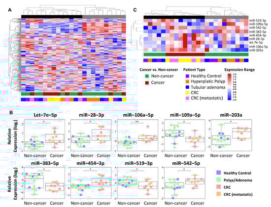 Unsupervised hierarchical clustering analysis did not demonstrate a clear stratification between cancer and non-cancer samples (Figure 2A). These groups were statistically compared, unveiling nine miRNAs with differential expression in plasma (Figure 2B and Table S2). Increased expression levels of miR-542-5p, miR-28-3p, miR-106a-5p, let-7e-5p, miR-454-3p, and miR-203a and decreased expression levels of miR-190a-5p, miR-383-5p, and miR-519a-3p were detected in CRC patients compared with the non-cancer group (Figure 2B). A supervised hierarchical clustering analysis, including these nine miRNAs, revealed a group of six miRNAs associated with cancer- (Figure 2C). One cluster enriched of cancer patients (black) and another (gray) composed exclusively of non-cancer individuals (healthy volunteers and patients with hyperplastic polyps and adenomas) were also observed (top of Figure 2A,C).