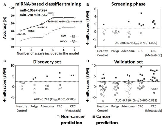 In the present study, the combination of four circulating overexpressed miRNAs (let-7e-5p, miR-106a-5p, miR-28-3p, and miR-542-5p) distinguished patients with CRC from healthy subjects and individuals with precursor lesions, particularly, hyperplastic polyps and adenomas. These findings indicate the potential of this circulating miRNA signature in predicting tumors in the colon and rectum at early stages. We used the Recursive Feature Elimination method to test multiple marker combinations and LOOCV to estimate the performance to avoid a marker selection bias. The combinations tested in our study were systematically defined, including only statistically significant individual markers overrepresented in the plasma of the cancer patients, using the recursive elimination method before training the classifier (SVM method). The recursive feature elimination method is based on removing the weakest features until a specific number of features is reached, avoiding collinearity and dependencies inside the model [].