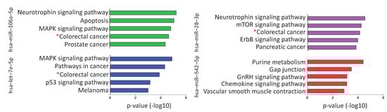 MicroRNAs regulate numerous target mRNAs that are involved in critical signaling pathways. Based on predicted interactions (miRWalk, miRanda, RNAhybrid, and Targetscan), miR-106a-5p, let-7e-5p, miR-28-3p, and miR-542 were estimated to regulate 2239, 1020, 637, and 203 mRNA targets, respectively (Table S6). The biological pathways enriched with the miRNA targets (performed separately for each miRNA) were mainly cancer-related (Tables S5 and S6 and Figure S3). The colorectal cancer pathway was among the most significant pathways for three of four tested miRNAs (miR-106a-5p, let-7e-5p, and miR-28-3p) (Figure 6).