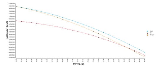 To investigate the comparative cost-effectiveness for several thresholds of patient age, a corresponding cost-effectiveness analysis was performed (Figure 1). This resulted in MWA being a suitable option for a broad range of patients, with a tendency towards surgery for younger and towards RFA for older patients. Based on a WTP of USD 100,000 per QALY, MWA yielded the highest net monetary benefit (NMB) in a starting age ranging from 60 to 85 years. In particular, the NMB ranged from USD 800,000 for MWA and surgery for a patient aged 60 years, to consistently more than USD 400,000 for all modalities in the case of a patient aged 85 years. The NMB is defined as the difference of the product of effectiveness and WTP and the actual costs of a treatment [14,15].