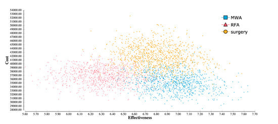Cost-effectiveness scatterplot based on 30,000 iterations shows a higher effectiveness of MWA and surgery when compared to RFA. Additionally, MWA results in average lower costs than surgery.