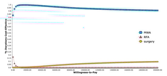 To further investigate the influence of all input variables, a probabilistic sensitivity analysis was performed. This analysis showed results in favor of MWA, with an overall higher effectiveness than RFA and lower overall costs than surgery (Figure 2). A WTP-dependent analysis showed that for all WTP thresholds from USD 0 per QALY to USD 200,000 per QALY, MWA was a cost-effective strategy in more than 80% of iterations (Figure 3).