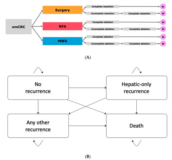 Model structure. (A) Overall model discriminating between the three treatment modalities surgery, microwave ablation (MWA) and radiofrequency ablation (RFA). (B) Markov Model for simulation of long-term outcomes containing the states “No recurrence”, “Hepatic-only recurrence”, “Any other recurrence” and “Death”.