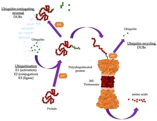 DUBs rescue ubiquitin chains before the substrate protein is degraded by the 26S proteasome. Unbound ubiquitin chains are then processed by other DUBs to restore the free cellular ubiquitin pool. DUB genes are classified into two main groups– cysteine proteases and zinc metalloproteases [13]. DUBs can be categorized into five subclasses: Ubiquitin-specific proteases (USPs), ovarian tumor proteases (OTUs), Machado–Joseph domain proteases (MJDs), ubiquitin C-terminal hydrolases (UCHs), and Jab1/Mov34/Mpr1 Pad1 N-terminal+ (MPN+) (JAMM) domain metalloproteases [72]. Post-translational modification of proteins by ubiquitination affects the targeted protein in several ways: (i) It determines if the ubiquitinated proteins remain in the cell or to be degraded by the proteasome, (ii) it affects the cellular localization of proteins, (iii) it determines protein activity or inactivity, and (iv) it facilitates protein–protein interactions [73,74,75].