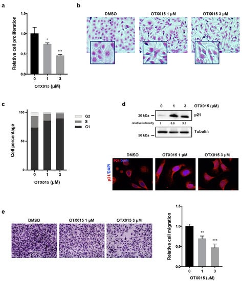 Furthermore, drug treatment clearly affected the morphological appearance of SKOV3, as confirmed by Giemsa staining, with OTX015-treated cells that became smaller, less dense, and showed longer filaments in comparison to DMSO-treated cells (Figure 1b). To further determine whether the OTX015-dependent reduction in OC cell growth was due alterations in cell cycle progression, flow cytometry analysis was performed in SKOV3 cells treated with or without OTX015 at different concentrations (0–1–3 μM). OTX015-treated cells showed a drastic arrest at G1 phase and a decrease in both S and G2 phases, whilst mocked control cells rapidly progressed through the cell cycle (Figure 1c). Consistent with the observed G1 arrest, an evident upregulation of p21 protein levels and its translocation in the nuclear compartment were found in OTX015-treated cells in comparison with DMSO-exposed controls (Figure 1d). Trans-well migration assays demonstrated that OTX015 treatment (1 μM and 3 μM) dose-dependently suppressed the ability of SKOV3 cells by about 30% (at 1 µM) and 50% (at 3 µM) to migrate through Boyden chamber membranes towards serum-containing medium when compared with DMSO control (Figure 1e). Similar results were obtained in UWB1.289 cells, as reported in Figure S1. Altogether, these results indicate that BET inhibition changes OC cell morphology, reduces proliferation through the induction of cell cycle arrest at G1 phase, and inhibits their migration potential.