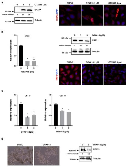 BET inhibition induces DNA damage and perturbs tumor spheroid architecture. (a) WB analysis (left panel) of γH2AX in SKOV3 cells treated with OTX015 (0–1–3 μM) for 72 h. Tubulin served as internal control. IF experiments (right panel) showing the presence of γH2AX foci (red) in OTX015 treated (1 and 3 μM) cells. DMSO was used in control cells. Nuclei (blue) were visualized with DAPI staining. Representative images captured under ApoTome microscope at 40× magnification. (b) q-PCR analysis of NRF2 mRNA levels (left panel) in SKOV3 cells exposed to OTX015 (0–1–3 μM), graphed as fold increase over not-treated cells, set at 1. β-actin mRNA was used as endogenous control. Histograms indicate mean values ±SD of two independent experiments, each performed in triplicate. Statistical significance vs. control cells was calculated by one-way ANOVA (* p < 0.05). WB experiments (upper right panel) performed on protein extracts from SKOV3 cells treated with OTX015 (0–1–3 μM) for 72 h. Tubulin served as loading control. IF experiments (lower right panel) showing the downregulation of NRF2 protein expression (red) in OTX015-exposed (1 μM and 3 μM) cells respect to untreated SKOV3 samples. (c) Transcript levels of GST-M1 and GST-T1 genes by q-PCR analysis in SKOV3 cells exposed to OTX015 (0–1–3 μM) and graphed as fold increase over not-treated cells, set at 1. β-actin mRNA was used as endogenous control. Histograms indicate mean values ±SD of two independent experiments, each performed in triplicate. Statistical significance vs. control cells was calculated by one-way ANOVA (* p < 0.05). (d) OTX015 alters spheroid formation in SKOV3 cells cultured in 24-well ultralow attachment plates with DMEM-F12/B27/EGF/FGF medium. Cells were photographed under a light microscope at 20× magnification (left panel) after 10 days of 3 μM OTX015 treatment (DMSO as control). WB of CD133 protein levels (right panel) in OTX015-exposed (0–3 μM) spheroids. Tubulin served as loading control. The original Western Blot images can be found in Figure S4.