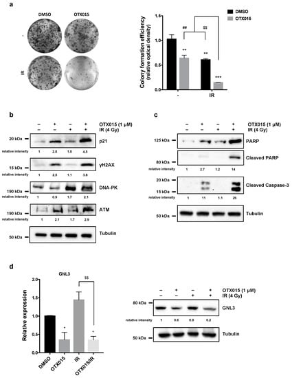OTX015 exposure radiosensitizes OC cells by inducing apoptosis and inhibiting colony-forming ability and DNA damage repair. SKOV3 cells, treated with or without OTX015 (1 μM), were exposed or not to radiation (4 Gy). (a) Four h after IR, SKOV3 cells were plated at low concentration and cultured for 12 days. Representative images of colonies marked with crystal violet. Colony formation efficiency was obtained by crystal violet optical density from different assays, each in triplicate. Histograms are means ± SD. Statistical significances were calculated by two-way ANOVA: ** p < 0.01 and *** p < 0.001, vs. DMSO without IR; $$ p < 0.01 vs. DMSO/IR; ## p < 0.01 vs. OTX015 without IR. (b) WB of selected markers of cell cycle arrest (p21) and DNA damage/response (γH2AX, DNA-PK, ATM) in SKOV3 cells with or without OTX015 and/or IR. Tubulin served as normalizer and representative blot was shown. (c) WB of specific proteins involved in apoptosis (PARP, Caspase-3) were performed on SKOV3 cells treated with or without OTX015 and/or IR. Tubulin served as loading control and representative blot was shown. (d) q-PCR analysis (left panel) of GNL3 transcript levels in OTX015/IR-exposed SKOV3 cells, expressed as fold change over control cells (DMSO), set at 1. β-actin mRNA was used as endogenous control. Histograms indicate mean values ± SD of three independent experiments, each in triplicate. Statistical significances were calculated by two-way ANOVA (* p < 0.05 vs. DMSO; $$ p < 0.01 vs. IR). WB analysis (right panel) performed on protein extracts from OTX015/IR-exposed SKOV3 cells. Tubulin served as normalizer. The original Western Blot images can be found in Figure S4.