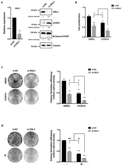Notably, when GNL3 silencing was used together with OTX015 (1 µM), the lowest effect on proliferation rate was observed compared to control cells (** p < 0.01 in Figure 6b). GNL3 siRNA drastically reduced the colony formation ability as shown in Figure 6c (left panel), also indicated by crystal violet absorbance in which comparisons between si-GNL3/OTX015 vs. si-GNL3 transfection alone or vs. OTX015 alone were significant (# p < 0.05 and $ p < 0.05, respectively in Figure 6c, right panel), this confirming a synergist effect of the cotreatment. Moreover, colony-forming assays confirmed that si-GNL3/IR coexposure was significantly more efficient than the single exposure to GNL3 siRNA transfection or to IR in dropping colony formation ability of SKOV3 cells (Figure 6d), with a reduced number of colonies to approximately 85% (*** p < 0.001) in si-GNL3/IR samples, whilst si-GNL3 led to a reduction at about 50% (*** p < 0.001) and IR of about 60% (*** p < 0.001) in comparison to DMSO-treated cells (Figure 6d, right panel). Markedly, comparisons between si-GNL3/IR vs. GNL3 siRNA or vs. IR alone were significant (### p < 0.001 and $$ p < 0.01, respectively), this indicating that GNL3 knocking down is able to radiosensitize OC cells.
