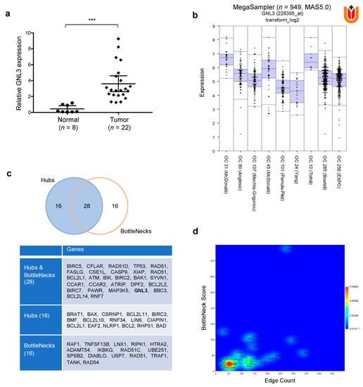 Biological significance of GNL3 expression in OC tumorigenesis. (a) GNL3 mRNA expression was assessed in 22 OC tumor biopsies and 8 non-tumoral ovarian tissues by q-PCR assays (*** p < 0.001). (b) Using ‘R2: Genomics Analysis and Visualization Platform (http://r2.amc.nl (accessed on 20 December 2020)), the expression of GNL3 gene was assessed in 9 different databases referred to different Ovarian Cancers, and it results always overexpressed, n = 949, p = 2.2 × 10−43 (c) The nodes acting as controller within the network are identified and classified as Hubs and BottleNecks, Hubs, or BottleNecks depending on their node degree and BottleNeck score. (d) A 2D Kernel Density Estimation (2D-KDE), Gaussian model, was carried out on Hubs and BottleNecks based on their node degree (x-axis) and BottleNecks score (y-axis).