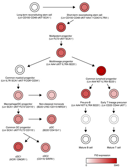 - Karsunky, H.; Merad, M.; Cozzio, A.; Weissman, I.L.; Manz, M.G. Flt3 Ligand Regulates Dendritic Cell Development from Flt3 + Lymphoid and Myeloid-committed Progenitors to Flt3 + Dendritic Cells In Vivo. J. Exp. Med. 2003, 198, 305–313. [Google Scholar] [CrossRef]